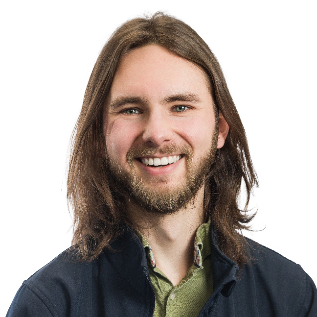 Smiling person with wavy brown hair, wearing a dark patterned shirt, against a white background.