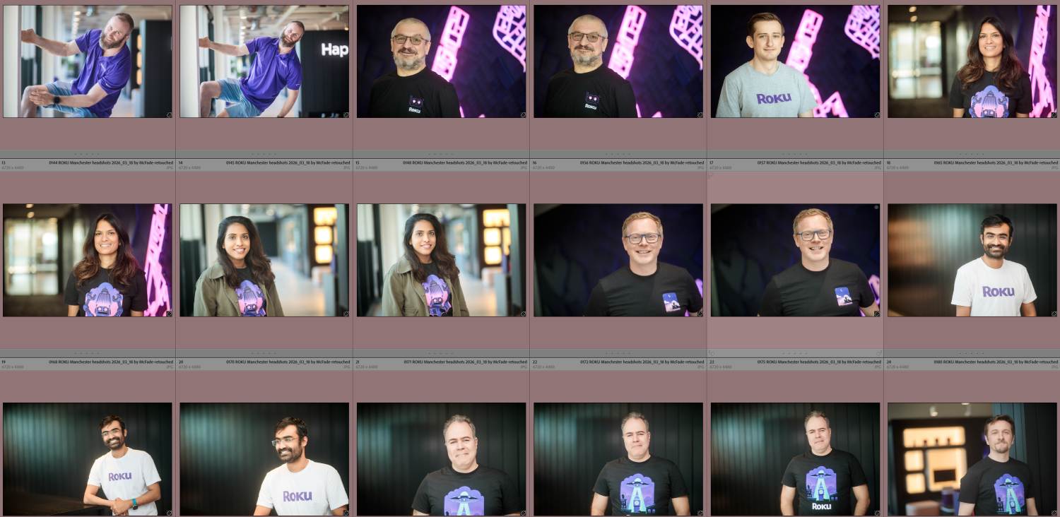Photoshop’s AI-powered Remove Background tool is now remarkably accurate. This means we no longer need a perfectly lit, purpose-built white backdrop room — a pop-up background in a reasonably sized meeting room is now enough. More flexibility, fewer logistical headaches.